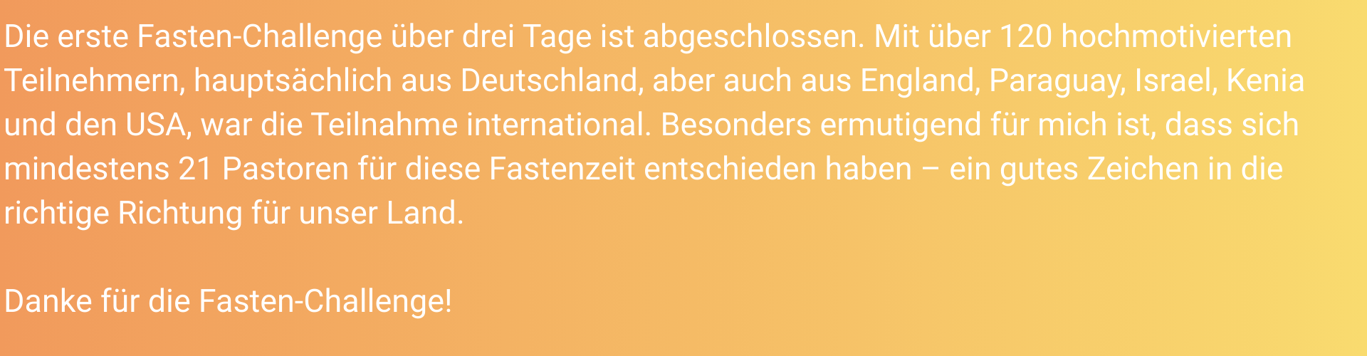 „Das Fasten kann eine große Herausforderung sein, doch es war unglaublich unterstützend, diesen Weg gemeinsam mit anderen zu gehen. Obwohl alles online stattfand, war es ein echter Segen, zu wissen, dass viele andere denselben Weg beschritten. Besonders die morgendlichen Impulse waren eine große Hilfe, um den Tag gut auszurichten und fokussiert zu starten“